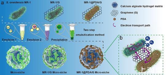研究簡介:為了應對全球能源挑戰和環境問題,迫切需要可持續和生態友好的能源供應,這推動了眾多新技術的發展。多種細菌物種已被用于氫氣(H2)生產或通過生物質和廢水處理進行可再生生物發電。在為這些系統提供動力的細菌中,希瓦氏菌于20世紀80年代末被發現,是一種異化金屬還原微生物,因其將電子從細胞質呼吸氧化反應轉移到外部含金屬礦物質的能力而受到廣泛研究。鑒于H2燃料是最有前途的化石燃料替代品之一,將化學能創新為H 2能源的發達生物制造應該代表一種有前景的方法。大規模H2生產對環境影響較小。由于氫化酶的不耐氧性或半導體的生物相容性較低,微生物生物制氫在產氫速率和持續時間上的進一步提高仍然需要研究人員付出很大的努力。構建一個穩定有效的厭氧環境來激活氫化酶對于可持續的H2生成至關重要,盡管它在整個細胞中仍然很大程度上未被探索。研究人員提出了一種通過將奧奈達湖桿菌細胞摻入海藻酸鈣/石墨烯基質中來產生人工微生態位的方法。形成的微生態位呈微粒形式,每個微生態位(41μm)平均有847個奧奈達湖桿菌細胞。本論文研究了奧奈達湖桿菌細胞的呼吸代謝和空間協同作用,以促進微生態位內厭氧微環境的形成,從而有效地提高H2的產生。揭示了由于加入了包括石墨烯和聚多巴胺(PDA)在內的電活性物質而形成的導電微利基結構,該結構可以促進電子轉移。本研究開發的微利基增強H 2生產系統將擴展提高H 2生產的方法。