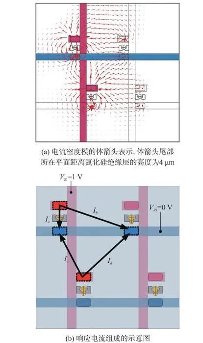 如圖4(a)、圖4(b)所示,響應電極R1記錄的響應電流I1由4部分構成,依次記為Ia、Ib、Ic、Id。其中,只有部分Ia流經C11所在的捕獲檢測單元,因此只有Ia反映母細胞C11的幾何尺寸信息。響應電流I1中Ia所占的比重越大,對于母細胞C11的檢測靈敏度越高。Ib流經C12所在的捕獲檢測單元,因此C12細胞存在與否主要影響Ib,進而對響應電流I1造成影響。C12細胞的存在使其所在捕獲檢測單元處的電阻抗提高,Ib減小,因此響應電流I1減小。C21細胞存在時其所在捕獲檢測單元處的電阻抗提高,造成Ic、Id增大,因此響應電流I1增大。
