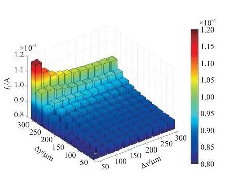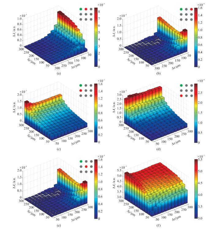 非檢測電極設為接地,仿真研究不同行列間距組合中單個鄰近細胞存在與否以及待測子細胞剪切造成的ΔAr。圖6(a)~圖6(e)分別反映了待測細胞C11的鄰近細胞C12、C13、C21、C31、C22存在時響應電流相對幅值ΔAr隨行列間距的變化。如圖6(a)、圖6(b)所示,總體上來看,隨著列間距的增大,C12細胞的存在造成了ΔAr顯著減小。由于C12細胞主要影響Ib,當行列間距均在100μm以下時,Ib在I1中所占比重較小,Ib的變化并未引起響應電流的顯著變化,因此ΔAr較小。隨著行間距的增大,Ic、Id逐漸減小,響應電流中Ib所占比重逐漸增大,因此ΔAr逐漸增大。C13細胞的存在引起ΔAr的變化相對于C12細胞的存在小一個數量級,因此其影響可以忽略。如圖6(c)、圖6(d)所示,隨著行間距的增大,C21細胞的存在引起ΔAr顯著減小。這是由于C21主要影響Ic、Id,隨著行間距的增大,Ic、Id逐漸減小,因此ΔAr也逐漸越小。C31細胞的存在引起ΔAr的變化相對于C21細胞的存在小一個數量級,因此其影響也可忽略。如圖6(e)所示,C22細胞的存在引起ΔAr的變化比C12、C21細胞的存在小1到2個數量級,其影響忽略。待測細胞C11的子細胞剪切引起ΔAr的變化如圖6(f)所示。總體上,隨著行列間距的增大,C11子細胞剪切的檢測靈敏度逐漸增大。