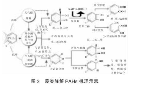 浮游藻類對多環芳烴的降解,主要通過2種方式實現:①以多環芳烴作為唯一碳源和能源;②多環芳烴與其它有機物質以共代謝方式被降解。研究表明,藻體細胞首先通過生物轉化將PAHs轉化成易代謝的分子,然后通過礦化作用將有機代謝產物轉化成無機礦物質。JUHASZ等的研究表明,羊角月牙藻通過類似于細菌的雙加氧酶途徑降解苯并芘。CHAN等2006年研究了羊角月牙藻對菲、芘和熒蒽的降解行為。發現單加氧和雙加氧途徑同時存在于羊角月牙藻細胞內。羅麗娟等的研究成果進一步證實了羊角月牙藻細胞中既存在單加氧酶,也存在雙加氧酶,對低環PAHs主要是采用單加氧酶系統進行代謝,即藻體細胞通過單加氧酶,加一個氧原子到苯環上形成環氧化物,轉化為反式一二氫二醇后進一步礦化:而對高環芳烴則主要采用雙加氧酶系統進行代謝,通常認為,藻類主要是利用雙加氧酶進攻苯環形成鄰苯二酚,而后鄰苯二酚通過鄰位或間位雙加氧酶的作用裂解為粘康酸半醛或粘康酸,從而使苯環斷裂。催化鄰苯二酚內開環即鄰位裂解的酶是鄰苯二酚1,2一雙加氧酶,而催化鄰苯二酚外開環即間位裂解的酶是鄰苯二酚2,3一雙加氧酶。藻類降解PAHs的機理示意圖具體見圖3。