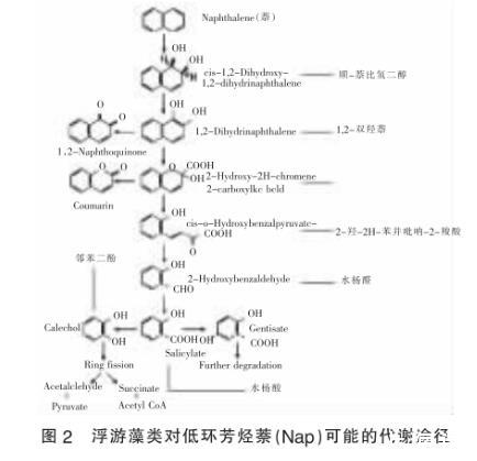 與細菌和真菌等微生物相比,浮游藻類對水體中PAHs降解的相關研究開展的較少。比較早的有CERNIGLIA等在1982年的研究,研究表明l8個不同門類的微藻,包括藍藻、硅藻、綠藻、紅藻等均對萘(NAP)均具有一定的降解能力,推測其分解代謝的基本途徑為:萘首先代謝為水楊酸,再轉化為鄰苯二酚。隨后進入三羧酸循~(TCA1進一步氧化開環徹底降解為二氧化碳和水,實現完全降解,其具體代謝途徑見圖2。