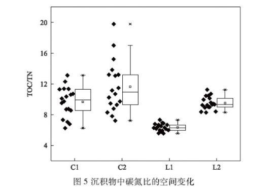 為進(jìn)一步驗(yàn)證沉積物中有機(jī)質(zhì)來(lái)源,對(duì)沉積物中TOC和TN含量進(jìn)行分析。由于陸生高等植物纖維素含量較高而蛋白質(zhì)含量較低,而湖泊內(nèi)源有機(jī)質(zhì)富含蛋白質(zhì),纖維素含量低。一般而言,陸生高等植物的有機(jī)質(zhì)C/N比通常為20——30,內(nèi)源藻類有機(jī)質(zhì)TOC/TN比為4——10之間,沉積物有機(jī)質(zhì)TOC/TN比大于10則認(rèn)為受到藻源性和陸源性有機(jī)質(zhì)的共同影響。因此,利用沉積物中碳氮元素比可以判斷沉積物中有機(jī)質(zhì)的來(lái)源是湖泊自身還是外源輸入。由圖5可知,湖濱帶(L1和L2)沉積物中,TOC/TN分別在5.6——7.3和8.3——11.3之間,而開敞湖區(qū)(C1和C2)沉積物中,TOC/TN比分別在6.3——13.1和7.2——19.8之間。究其原因,在主導(dǎo)風(fēng)向東南風(fēng)的作用下,在竺山灣湖濱帶、侵蝕漕及挺水植物群叢內(nèi),堆積了大量碎屑?xì)報(bào)w而形成堆積層,該堆積層主要是藻類碎屑?xì)報(bào)w占優(yōu),局部區(qū)域夾帶著水生植物碎屑?xì)報(bào)w及外源有機(jī)質(zhì),因而TOC/TN偏低。因此,根據(jù)以上的結(jié)果綜合判斷,太湖西北湖區(qū)竺山灣沉積物中有機(jī)質(zhì)以藻源性為主,而開敞湖區(qū)沉積物中有機(jī)質(zhì)則呈現(xiàn)出藻源性和陸源性混合輸入的特征。
