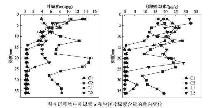 圖4沉積物中葉綠素a和脫鎂葉綠素含量的垂向變化