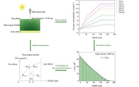 研究簡介:隨著經濟的發展和人口的增長,對水資源的需求不斷增加。廢水回收似乎是緩解該問題的另一種方法?;谖⒃宓膹U水處理由于其附加的生物資源轉化和碳捕獲利用而引起了研究人員的廣泛關注。目前懸浮培養模式作為常規微藻培養方法已被廣泛使用,但由于微藻密度低、尺寸小,從水中回收生物質是能源密集型且成本高。光被認為是影響微藻光合作用的關鍵因素之一,而光強度過高或過低都可能對微藻增殖產生負面影響。由于生物膜中致密的生物質可能存在傳輸阻力,生物膜內部的光或營養物質可能分布不均勻,導致生物膜內不同深度的代謝類型和代謝速率不同。DO微電極和擴散反應模型的結合已用于估計生物膜或活性污泥顆粒微環境內的氧濃度變化。近年來有研究人員使用微電極監測SBBR生物膜中的DO水平并計算細菌生物膜的氧擴散效率。它表現出與水膜中線性分布不同的指數下降趨勢。也有相關研究人員基于直接測量氧微剖面的空間梯度,評估了光生物膜反應器中培養的微藻生物膜的光合作用。在現場規模的實驗中,生物膜表面附近的照明部分的氧氣濃度大約是廢水中測量的氧氣濃度的三倍。先前關于氧氣分布和光合速率的工作已經在一些生物膜或顆粒污泥中進行。然而缺乏量化微藻生物膜內不同深度的光合速率的方法。本研究通過微電極檢測不同光強下生物膜內部不同深度的DO濃度,進一步建立描述微藻生物膜光合速率沿深度變化的模型,揭示微藻生物膜生長的調控機制。