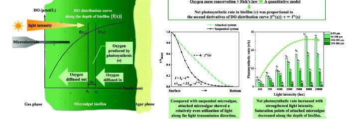 建立了一個模型來量化附著微藻生物膜的光合速率,發現附著微藻的光利用模式與懸浮微藻的光利用模式有根本不同。此外150-200μm深度的微藻生物膜的光合速率遠低于表面微藻,但低光強度下培養的內部微藻可以隨著光強度的增加恢復更高的光合能力。然而由于隨著時間的推移對較暗條件的適應,深層微藻的光飽和點低于表面微藻。