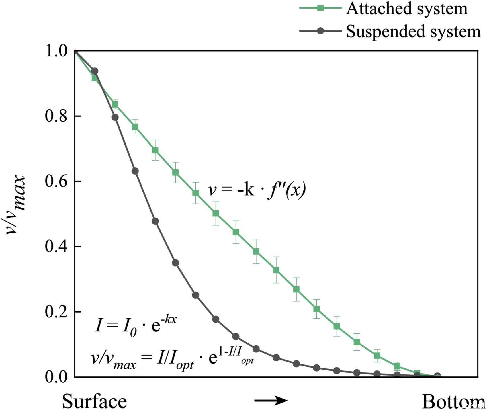 圖2、懸浮和附著藻類培養系統中光合作用的垂直下降趨勢。