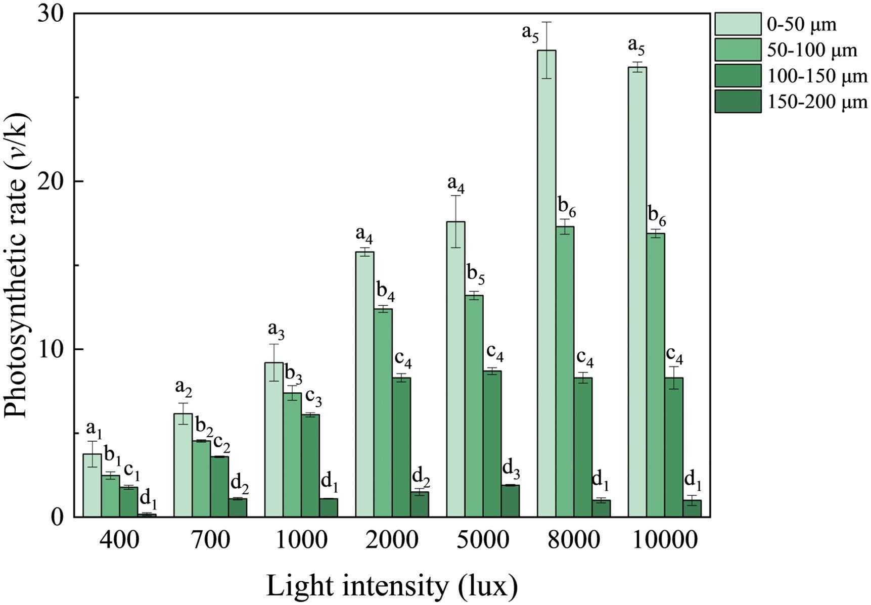 圖3、一系列光強下不同深度的光合速率。在相同光照強度下,隨著深度的增加,光合速率逐漸降低。150~200μm深度的微藻生物膜幾乎沒有光合活性,光合速率水平僅為表層的3.60%~17.86%。