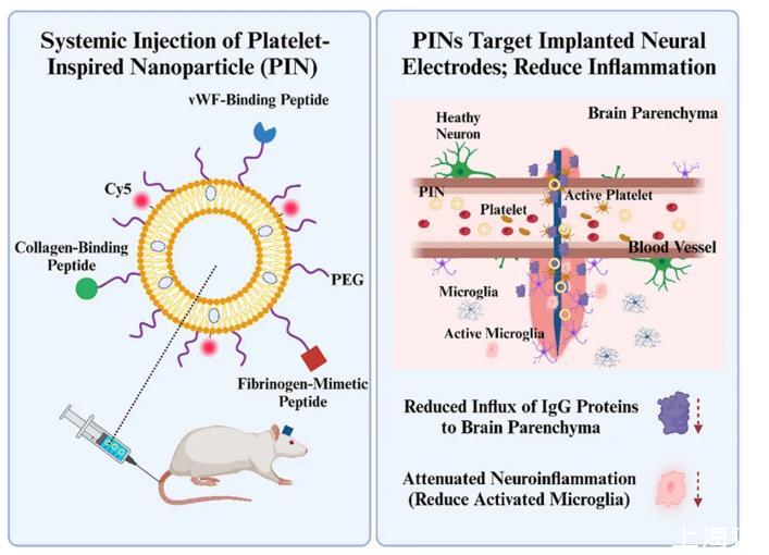 血小板仿生納米顆粒(PINs)具有損傷靶向功能,通過結合膠原結合肽(CBP)、馮·維勒布蘭德因子結合肽(VBP)和纖維蛋白原模擬肽(FMP),模擬活性血小板的粘附和聚集。系統性給藥的PINs可能增強止血作用,并促進皮質內微電極(IMEs)插入引起的血腦屏障(BBB)滲漏的重新封閉,從而減少血液源性蛋白進入腦實質引發的神經炎癥。本研究探討了PINs在減輕植入部位神經炎癥方面的潛力。