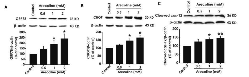 圖4、檳榔堿對PC12細(xì)胞內(nèi)質(zhì)網(wǎng)應(yīng)激的影響。PC12細(xì)胞經(jīng)0.5、1和2mM的檳榔堿處理24小時(shí)后,用Western印跡法測定葡萄糖調(diào)節(jié)蛋白78(GRP78)(a)、CCAAT/增強(qiáng)子結(jié)合蛋白(C/EBP)同源蛋白(CHOP)(b)和裂解的caspase-12蛋白(c)的表達(dá)。在所有印跡中,β-actin均用作負(fù)載對照。