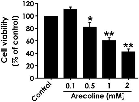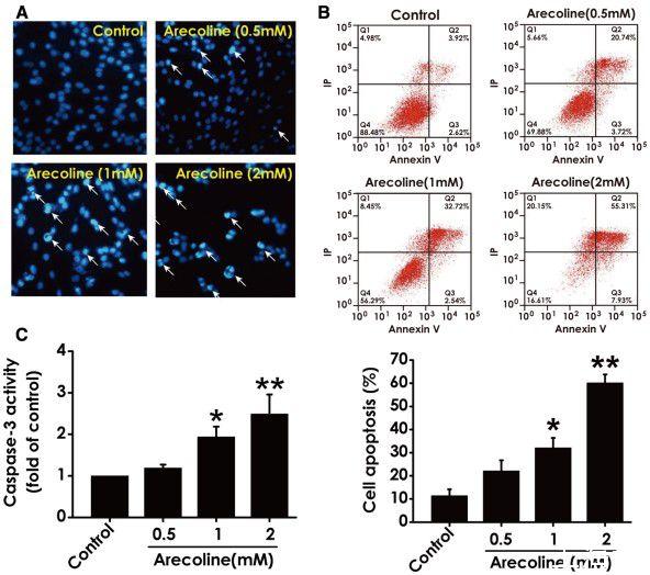 圖2、檳榔堿對PC12細(xì)胞凋亡的影響。PC12細(xì)胞分別用0.5、1和2mM的檳榔堿處理24小時(shí)。A,熒光顯微鏡(200×)顯示了用Hoechst 33258染色的PC12細(xì)胞的核形態(tài)。細(xì)胞核發(fā)出明亮熒光并破碎的細(xì)胞代表凋亡細(xì)胞。B,caspase-3活性通過Elisa進(jìn)行評估,每個(gè)實(shí)驗(yàn)條件下獲得的caspase-3活性水平以對照的倍數(shù)計(jì)算。C,凋亡細(xì)胞的百分比通過annexinV-FITC/PI染色進(jìn)行量化。數(shù)據(jù)為三個(gè)獨(dú)立實(shí)驗(yàn)的代表性圖像,數(shù)值為平均值±SEM,*P<0.05;**P<0.01,與對照組相比。