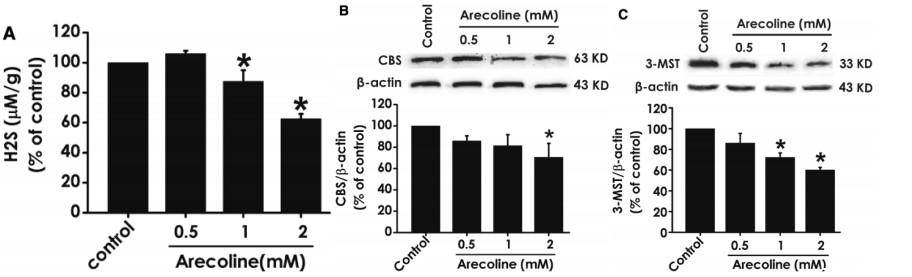 圖5、檳榔堿對PC12細(xì)胞產(chǎn)生內(nèi)源性H2S的影響。a如“材料與方法”一節(jié)所述,用單義硫化氫微電極檢測細(xì)胞培養(yǎng)上清中H2S的含量。PC12細(xì)胞中CBS蛋白(b)和3-MST蛋白(c)的表達(dá)量通過Western印跡法測定。Western印跡圖像顯示了三個(gè)獨(dú)立實(shí)驗(yàn)的代表性結(jié)果。在所有印跡中,β-actin均用作負(fù)載對照。