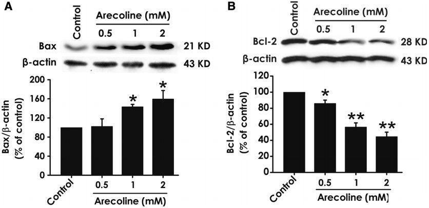 圖3、檳榔堿對PC12細(xì)胞中Bax和Bcl-2蛋白表達(dá)的影響。用抗Bax抗體和抗Bcl-2抗體分別對PC12細(xì)胞中Bax(a)和Bcl-2(b)蛋白的表達(dá)進(jìn)行免疫印跡檢測。在所有印跡中,β-actin均用作負(fù)載對照。數(shù)據(jù)為三個(gè)獨(dú)立實(shí)驗(yàn)的代表性圖像,數(shù)值為平均值±SEM,*P<0.05;**P<0.01;與對照組相比。