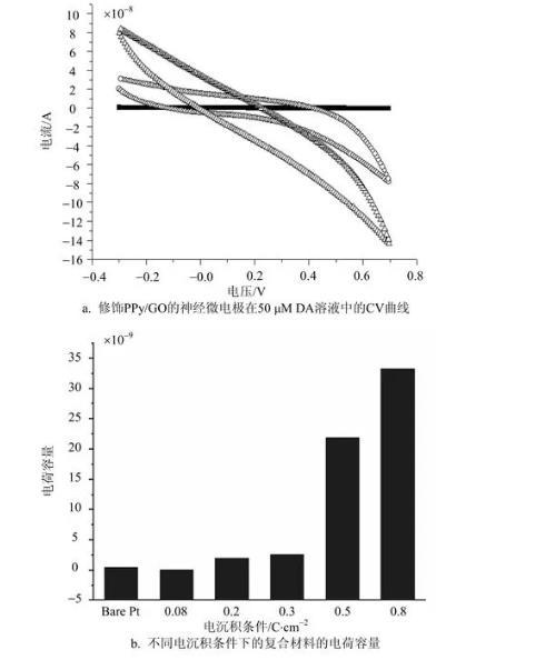 不同電量密度電聚合成的PPy/GO有不同的電化學性質。圖4a為修飾有PPy/GO的神經微電極在50μM DA溶液中的伏安響應,其中包括裸Pt電極,使用0.3 C/cm2和0.8 C/cm2電量密度修飾的神經微電極的循環伏安曲線(CV曲線),Bare Pt—(■),0.3 C/cm2—(○),0.8 C/cm2—(△),分別為PPy/GO的電沉積條件。圖4b為不同電沉積條件下的復合材料的電荷容量。對于采用循環伏安法獲得的CV曲線的電荷容量為: