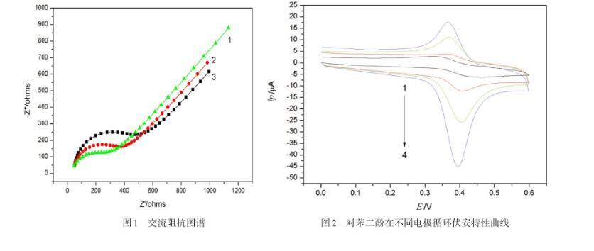 利用電化學(xué)阻抗技術(shù)(EIS)通過不同修飾電極,對(duì)K3[Fe(CN)6]以及KCl溶液進(jìn)行測(cè)定表征,表征圖譜如圖1.由圖1可明顯看出,在3-谷氨酸修飾電極上,會(huì)有一個(gè)比2-石墨烯修飾電極以及1-聚L-谷氨酸/石墨烯修飾電極稍大的圓弧,而圓弧越大,表明電極的電阻率越大,電子傳遞速率越低。因此,從圖1中可知,聚L-谷氨酸/石墨烯修飾電極的電阻率最小,電子傳遞速率最佳。