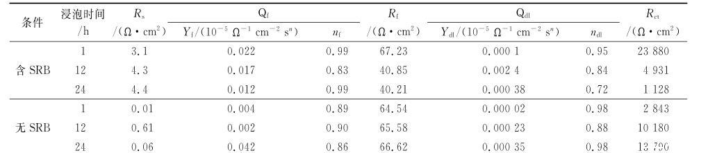 由表3可見:在浸泡初期,由于SRB的吸附,含SRB溶液中Rf、Rct相對于滅菌溶液中的有所增加;隨著浸泡時間的延長,含SRB溶液中,Rf,Rct都有所降低。這表明隨著試驗的進行,SRB產生的硫化物增多,腐蝕產物膜的導電率增加,腐蝕產物膜阻抗Rf降低。同時,SRB代謝產物與金屬間的直接電子轉移,使Rct減小促進腐蝕加速過程。在不含SRB溶液中,隨著浸泡時間的延長,H2S腐蝕使試樣產生均勻的腐蝕產物膜,由于產物膜的保護作用,Rf、Rct有所增加,腐蝕減弱,這一試驗結果與極化曲線的測量結果一致。