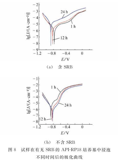 在含SRB溶液中,浸泡初期,SRB大量吸附在試樣表面,生物膜的存在一定程度上阻礙了腐蝕的進一步發展,使自腐蝕電位相對于滅菌條件下的有所增加;隨著浸泡時間的延長,自腐蝕電位開始負移,腐蝕電流密度開始變大。這是因為:首先隨著浸泡時間的增加SRB的繁殖改變了溶液中離子成分,生成的硫化物導電性增加,自腐蝕電位降低,這使得管材在SRB環境中更容易發生腐蝕,其次SRB腐蝕生成的FeS與鐵基體接觸時還能對陰極析氫產生催化作用而形成腐蝕電偶加速腐蝕。在滅菌條件下,隨著浸泡時間的延長,H2S使試樣產生均勻的腐蝕產物膜,由于產物膜的保護,試樣的自腐蝕電位正移,腐蝕電流密度減小,試樣得到保護。