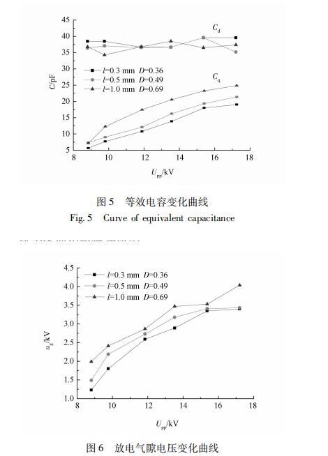 根據(jù)MDBD等效電路,利用等效電容方法,可得到C=C、C+C。=k C,進(jìn)而獲得不同尺寸微腔結(jié)構(gòu)電極在不同下的和c變化曲線,如圖5所示。從圖中可以看出,在電源頻率固定不變時,隨著的增高,C變化很小,其平均常數(shù)值近似為37pF;且在改變微腔尺寸時,C也基本在此值附近上下浮動;而C。隨著U的增高則不斷增大,且當(dāng)。一定時,隨著微腔尺寸的改變,D相應(yīng)的增大,C也不斷增大。