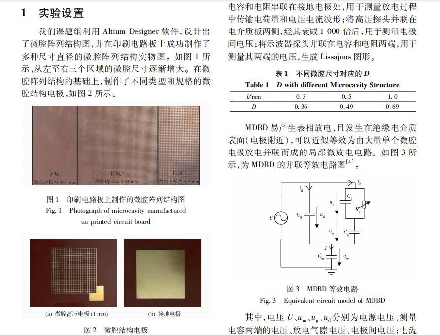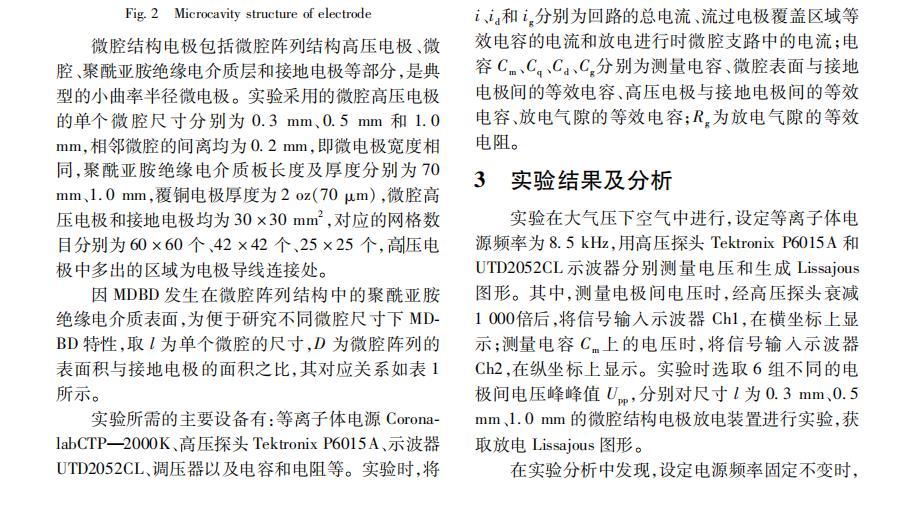 目前本研究領(lǐng)域尚未達(dá)成共識,沒有形成統(tǒng)一理論。研究不同高壓電極下介質(zhì)阻擋放電的特性,以及改進(jìn)常規(guī)制取低溫等離子體的高壓電極結(jié)構(gòu),具有重要的理論意義和工業(yè)應(yīng)用價值。為進(jìn)一步實現(xiàn)降低放電起始電壓,充分利用電暈放電的預(yù)電離作用,產(chǎn)生數(shù)量較多、分布較均勻的非平衡態(tài)低溫等離子體,本文設(shè)計并制作了一種新型的微腔結(jié)構(gòu)電極,并利用制作的不同類型和規(guī)格的微電極,設(shè)計實驗研究裝置,建立等效電路模型,根據(jù)獲得的Lissajous圖形分析不同尺寸微腔下的電壓電流波形、電極間的等效電容、放電氣隙電壓、半個周期放電通道傳輸?shù)碾姾闪俊⑵骄烹姽β室约半娊橘|(zhì)表面功率密度等參量的變化情況,研究微腔介質(zhì)阻擋放電(microcavity dielectric barrierdischarge,MD—BD)。
