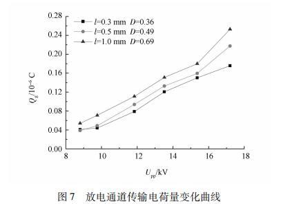 MDBD的微腔邊緣和內(nèi)部存在不均勻電場,且電子電離系數(shù)對場強(qiáng)比較敏感,滿足發(fā)展流注的臨界條件,因此氣隙的擊穿屬于流注放電。流注放電產(chǎn)生大量電子,電子從微腔邊緣向中心發(fā)展,隨著D的增大,微腔表面積增大,相應(yīng)傳輸電荷增多。如圖所示,可以看出半個周期內(nèi)放電通道傳輸?shù)碾姾闪縌隨著f/的升高而增多;且在f/,一定時,隨著,)的增大,Q逐漸增多;受大量的傳輸電荷在電介質(zhì)表面積累影響,實驗時在電極周圍可看見微光,隨著f/和D的增大,微光的亮度不斷增強(qiáng),發(fā)光面積逐漸增加,微放電的聲音也越來越清晰。