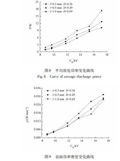 根據(jù)Lissajous圖形的面積和前面的分析,可以計算出平均放電功率P和微腔表面積的功率密度P,分別如圖8和圖9所示。MDBD受小曲率半徑微腔電極的影響,電場分布不均勻,易于發(fā)生電暈放電。從圖8中可以看出,隨著升高,電暈預(yù)電離的作用增強(qiáng),放電通道傳輸?shù)碾姾闪縌增多,平均放電功率P逐漸增大;且在f/一定時,隨著D增大,微腔電極與空氣接觸更充分,易于等離子體的形成與擴(kuò)散,因此P也逐漸變大,二者成正比。從圖9中可以看出,因u升高,平均放電功率P增大,p均呈現(xiàn)增加的趨勢;但因MDBD發(fā)生在微腔內(nèi)電介質(zhì)表面,放電最先在電極附近開始,隨著升高,放電面積逐漸增大,向微腔中心發(fā)展,在微腔表面先達(dá)到飽和,并逐漸向外擴(kuò)展,當(dāng)微腔尺寸較小,即D較小時,易于達(dá)到飽和,故從圖9中可以看出在單個微腔中,D較小時,P較大。