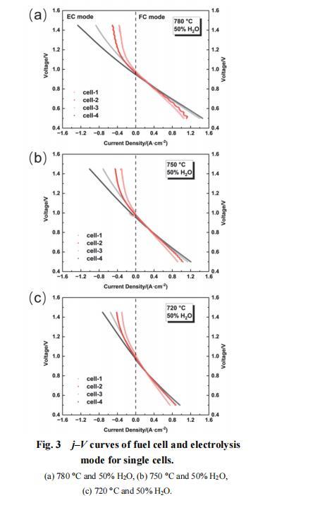 圖3為單電池在不同溫度下可逆運行的j–V曲線。從圖中可看出,所有單電池均表現出典型的電化學不對稱現象。小孔氫電極單電池在1.1 V左右的電解電壓下即出現濃差極化現象,主要是因為氫電極孔隙不足,導致氣體擴散受阻,與文獻7報道的R-SOC不對稱性行為主要源于氫電極氣體擴散的結論相符。