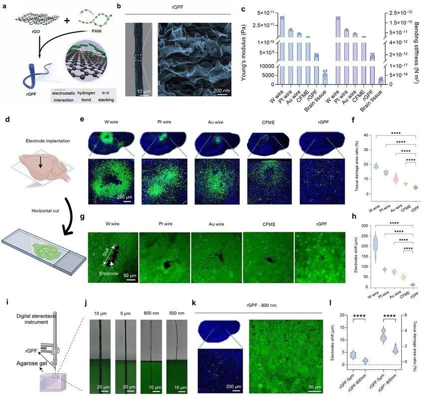 華東師范大學(xué)田陽教授團(tuán)隊近期創(chuàng)制了一種具有高生物相容性的自支撐植入式聚合物微電極(rGPF),實現(xiàn)了自由行為動物大腦中的Mg2+和Ca2+的同時監(jiān)測和實時量化。通過在還原氧化石墨烯(rGO)中摻入了導(dǎo)電性聚苯胺(PANI),形成了直徑約800 nm的rGPF超細(xì)電極。與傳統(tǒng)的金屬絲和碳纖維相比,rGPF表現(xiàn)出優(yōu)異的生物相容性和最小的物理損傷,這歸功于rGPF較低的楊氏模量。盡管直徑較小,但它仍表現(xiàn)出足夠的彎曲剛度,可直接自支撐植入小鼠腦深部區(qū)域,無需外部輔助裝置,從而降低了額外物理損傷的風(fēng)險(圖1)。