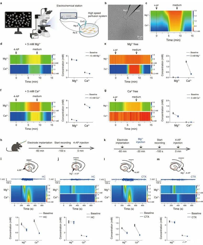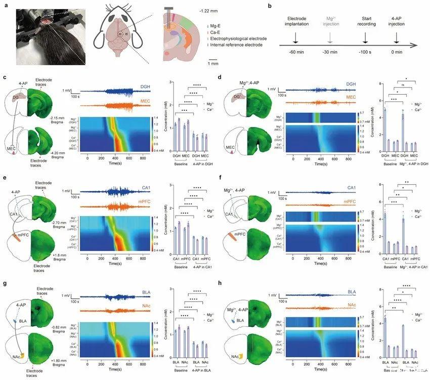 利用這一強(qiáng)大的工具,在體外4-氨基吡啶(4-AP)的誘導(dǎo)下,首次觀察到Mg2+的變化先于Ca2+,以及Mg2+對Ca2+內(nèi)流的拮抗作用(圖3)。此外,由于采用了無額外電流的電位測量法,Mg-E、Ca-E、內(nèi)參比電極和電生理電極被集成到了一個微電極束中,可按需植入目標(biāo)腦區(qū)而不會發(fā)生串?dāng)_。最終發(fā)現(xiàn),癲癇發(fā)作時細(xì)胞外Mg2+和Ca2+的初始變化時間與神經(jīng)通路相一致,在上游腦區(qū)添加Mg2+可抑制下游腦區(qū)的Ca2+流入和癲癇樣放電活動(圖4)。該結(jié)果被田陽教授團(tuán)隊首次報道。