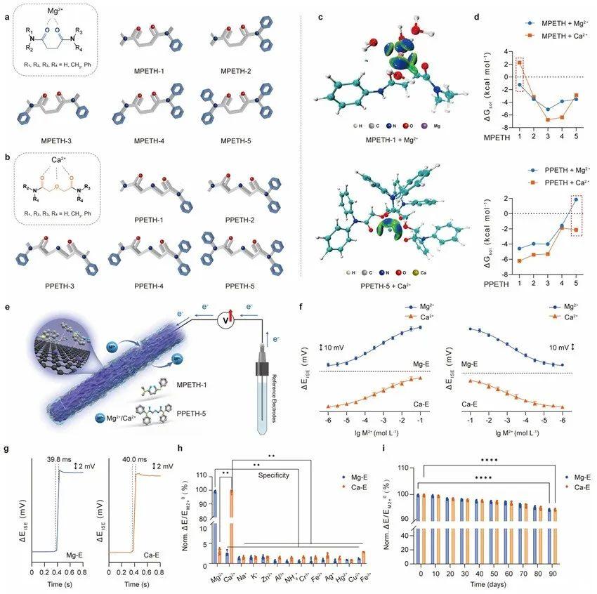 另一方面,由于Mg2+和Ca2+在神經(jīng)信號傳導(dǎo)和突觸可塑性中起著關(guān)鍵作用,該工作將它們作為研究模型,設(shè)計了一系列離子選擇性配體,通過密度泛函理論(DFT)計算進(jìn)行篩選。隨后,合成了兩種優(yōu)化的特異性離子配體(MPETH-1和PPETH-5),高選擇識別Mg2+和Ca2+,并利用π-π堆疊相互作用自組裝到電極表面,構(gòu)建了Mg-E和Ca-E電化學(xué)傳感器。Mg-E和Ca-E在識別Mg2+和Ca2+方面具有顯著的選擇性、良好的可逆性、快速的反應(yīng)時間和90天連續(xù)測試的穩(wěn)定性(圖2)。