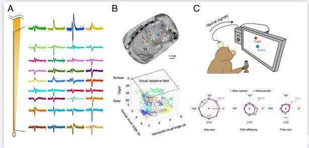實現對腦活動的高時空分辨率、高通量采集是深入理解腦功能的重要基礎。神經電極的廣泛使用,尤其是能夠分辨單個神經元活動的侵入式神經電極的應用,已經為基礎研究和臨床治療的進步做出了重要貢獻。隨著腦機接口技術的蓬勃發展以及其在運動功能修復等臨床治療中展現的突出優勢,在非人靈長類及人類大腦中實現長期穩定的高時空分辨率、高通量神經信號采集,已經成為目前神經科學領域及臨床醫療的熱點之一。