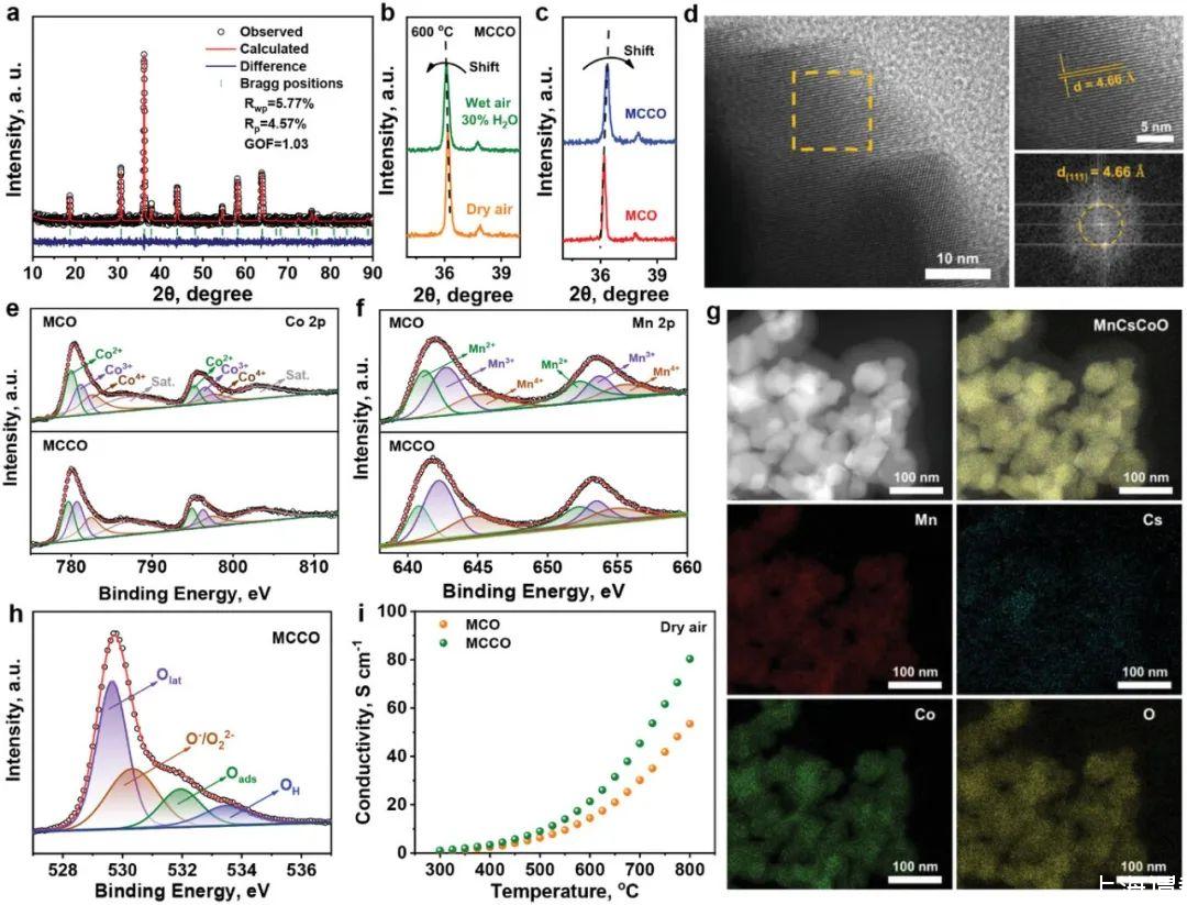 圖1 MCCO粉末的晶體結(jié)構(gòu)和特性。a)MCCO材料的精細XRD圖案。b)MCCO在600°C下蒸汽處理(30%H2O)10小時之前和之后的XRD圖案。c)MCO和MCCO粉末的XRD圖案。d)MCCO的高分辨率TEM圖像和快速傅里葉變換圖案。e)MCO和MCCO的Co 2p XPS曲線。f)MCO和MCCO的Mn 2p XPS結(jié)果。g)MCCO的HAADF圖像和EDS映射結(jié)果。h)MCCO的O 1s XPS曲線。i)300-800°C下MCO和MCCO的電導(dǎo)率。
