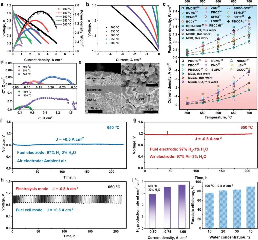圖3帶有MCCO-CO電極的PCEC在氧還原和水分解反應(yīng)中的電化學(xué)性能。a)在500-700°C下以FC模式測試MCCO-CO電池的I-V-P曲線。b)在500-700°C下以EC模式測試的MCCO-CO電池的I-V曲線。c)MCCO-CO與其他報告的電極比較。d)在500-700°C下測量的MCCO-CO單電池的EIS。e)MCCO-CO電池的SEM圖像。在650°C下以f)FC模式和g)EC模式測試的單電池的耐久性。h)在650°C時電流密度為±0.5 A/cm2的可逆循環(huán)操作,兩種模式之間切換間隔為2小時。i)在不同電解電流密度和蒸汽濃度下,采用MCCO-CO尖晶石氧電極的電池的H2生成速率和法拉第效率。