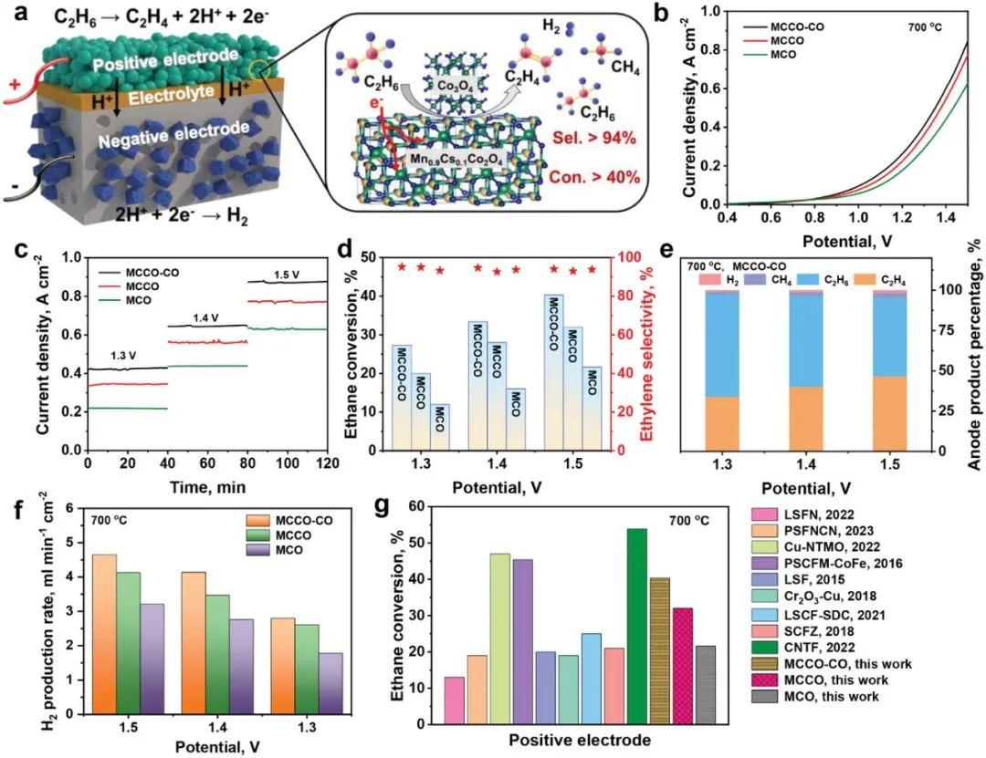 圖4 MCCO-CO電池用于乙烷非氧化脫氫的性能。a)PCEC中乙烷轉(zhuǎn)化為乙烯的示意圖。b)700°C下MCO、MCCO和MCCO-CO電極用于EDH的I-V曲線。c)1.3-1.5V下使用MCO、MCCO和MCCO-CO電極進行乙烷非氧化脫氫的短期穩(wěn)定性。d)1.3-1.5V下的乙烷轉(zhuǎn)化率和乙烯選擇性。e)700°C下使用MCCO-CO電極進行乙烷電化學(xué)非氧化脫氫的產(chǎn)物分析。f)1.3-1.5 V下EDH過程中具有不同尖晶石氧電極的電池的H2生成速率。g)MCCO-CO與其他最近報道的電極中乙烷轉(zhuǎn)化率的比較。