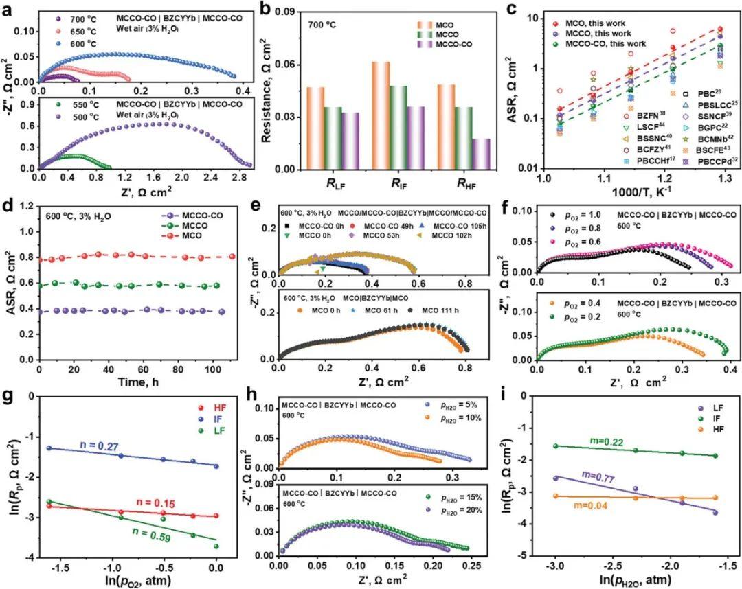 圖2 MCCO-CO電極的電化學(xué)性能和耐久性。a)在500-700°C下測量的MCCO-CO的EIS。b)在不同頻率范圍內(nèi)MCO、MCCO和MCCO-CO的Rp比較。c)MCCO-CO和其他電極的Rp值比較。d)在含有3%H2O的空氣中600°C時MCO、MCCO和MCCO-CO的短期穩(wěn)定性。e)在不同測試時間的MCO、MCCO和MCCO-CO的EIS。f)不同氧分壓下MCCO-CO對稱電池的EIS。g)MCCO-CO的Rp與p O2的依賴關(guān)系。h)不同水分壓下MCCO-CO對稱電池的EIS。i)MCCO–CO的Rp依賴性與p H2O的關(guān)系。