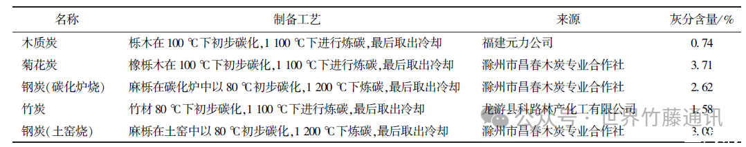 選擇木質(zhì)炭、菊花炭、鋼炭(碳化爐燒)、竹炭、以及鋼炭(土窯燒)5種木、竹基碳材料作為電極。具體碳化參數(shù)及來源見表1。