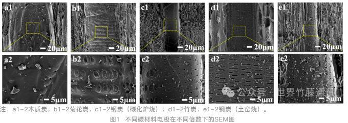 注:a1-2木質炭;b1-2菊花炭;c1-2鋼炭(碳化爐燒);d1-2竹炭;e1-2鋼炭(土窯燒)。圖1不同碳材料電極在不同倍數下的SEM圖