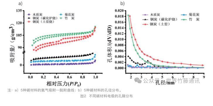 注:a)5種碳材料的氮氣吸附—脫附曲線;b)5種碳材料的孔徑分布。圖2不同碳材料電極的孔隙分布。