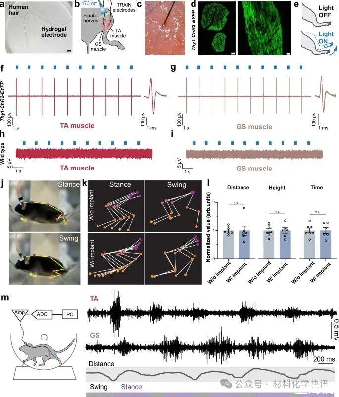 研究者開發了穿透性軟微電極能夠更精確地訪問深層神經組織,減少組織損傷,并實現長期在位的電生理信號記錄。通過在交聯聚乙烯醇(Polyvinyl alcohol,PVA)水凝膠基質中嵌入導電碳納米管(Carbon nanotubes,CNTs),賦予PVA水凝膠在復雜機械環境下的穩定導電性、低彈性模量、高抗疲勞性和優良的生物相容性。為驗證CNTs-PVA水凝膠柔性電子器件的導電性和穩定性,作者在自由活動狀態下的小鼠中成功記錄了肌電信號。