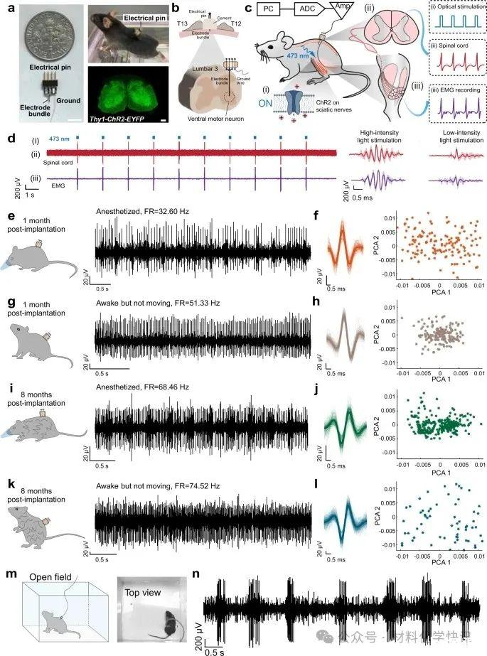 此外,該生物柔性電子器件還能在小鼠脊髓內腹角運動神經元(ventral horn motor neuron)中,連續記錄長達8個月的自發電生理信號,充分證明了其在長期神經監測中的潛在應用價值。
