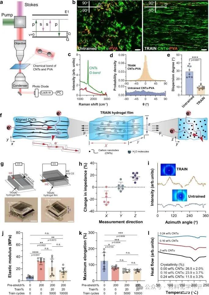 圖1基于張力增強各向異性納米取向(Tension Reinforcement for Anisotropic Nano-orientation,TRAIN)策略:用于提高水凝膠電極的導電性能