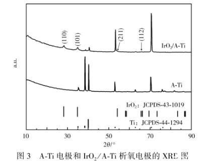 圖3 A-Ti電極和IrO2/A-Ti析氧電極的XRD圖