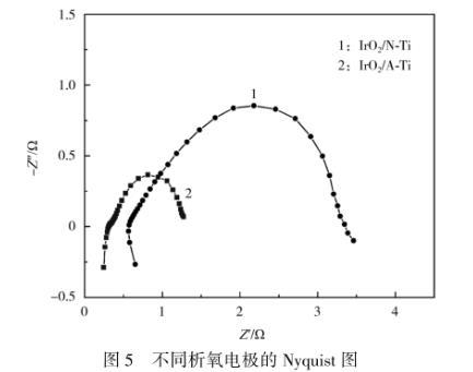 從圖5可知,IrO2/A-Ti電極的歐姆阻抗小于IrO2/N-Ti電極,推測可能與陽極極化有關。A-Ti表面的鈦基氧化物鈍化層被充分去除后,在負載IrO2過程發(fā)生氧化,生成TiOx;而未經(jīng)陽極極化處理的N-Ti表面,可能存在更多的TiO2鈍化層,導致電子傳導能力較差;此外,納米管陣列微結構形成的連續(xù)電子傳輸通道,也有助于降低歐姆阻抗。與IrO2/N-Ti電極相比,IrO2/A-Ti電極的電荷轉移阻抗更低,析氧電極表面有序化結構有利于建立連續(xù)化氣-液傳質通道,提高析氧催化反應所需的電子、質子傳輸能力,降低電化學反應阻力,對電催化劑催化活性的提升起到關鍵作用。