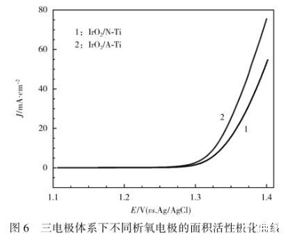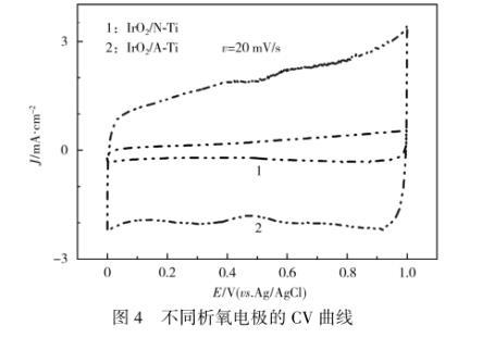 從圖4可知,不同析氧電極有相似的IrO2氧化還原過程,存在兩對氧化還原峰:位于0.60 V附近的峰對應于Ir(Ⅲ)/Ir(Ⅳ)氧化還原電對;位于0.95 V附近的峰對應于Ir(Ⅳ)/Ir(Ⅵ)氧化還原電對。對掃描速度為20 mV/s時獲得的CV曲線陽極部分積分得到的伏安電量,可定性評價電催化劑的催化活性面積。伏安電量越高,表明催化活性面積越大。A-Ti電極基體表面具有獨特的氧化鈦納米管陣列微結構,不僅能提供充足的表面,形成對活性組分IrO2更好的物理分散,還有助于形成連續(xù)的電子傳輸通道,提供更合適的傳質通道,有利于建立多相催化界面電催化活性位點[7]。