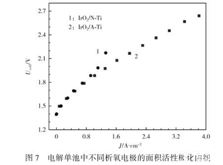 圖7電解單池中不同析氧電極的面積活性極化曲線