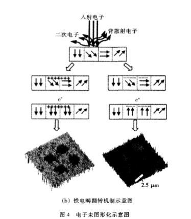第三種鐵電疇圖形化的方法是基于入射電子與鐵電表面的相互作用。圖4(a)為實驗裝置的示意圖,即為配備了刻蝕控制軟件的掃描電鏡,圖4(b)為電子與樣品的相互作用及鐵電疇翻轉機制的示意圖。當樣品表面被高能電子輻照,電子一品格相互作用將導致近表面區域產生一系列的物理現象,包括激發產生二次電子,生成人射電子的背散射電子,以及二次電子和背散射電子的發射和俘獲。在大多數情況下,入射電子不等于發射電子,這引起表面電荷積累。當表面電荷產生的電場大于鐵電材料的矯枉場時,即在表面附近發生鐵電疇的重新取向。