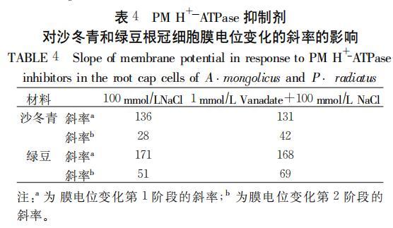 式趨勢雖然不明顯,但是從兩種處理下膜電位去極化斜率的變化可以發現,沙冬青和綠豆膜電位變化第2階段的斜率變化要明顯大于直接進行NaC1處理下(見表4)。也就是說,Vanadate將質膜H一ATP。活性抑制以后再進行鹽處理,離子在跨膜轉運過程中胞內離子外排受到一定程度限制,導致膜電位去極化增強。分析原因,主要是質膜H一ATPase的活性被抑制,不能水解ATP驅動質子運出胞質,也不能為次級轉運體提供足夠的能量將過多的Na+泵到胞外基質或液泡中,因此細胞內的凈陽離子數增多所致。