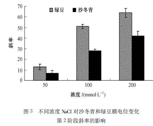圖3不同濃度NaC1對沙冬青和綠豆膜電位變化第2階段斜率的影響
