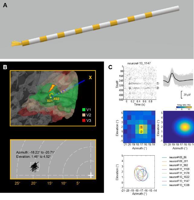 圖1.顱內電刺激V1誘發光幻視與附近單神經元感受野測量。(A)宏-微電極示意圖;(B)顱內電刺激V1誘發光幻視圖示。電刺激宏電極對(X01-X02)時(上圖),患者主觀報告并繪制所看到黑色光幻視(下圖);(C)微電極所記錄到V1神經元感受野結果。