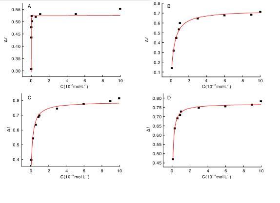 圖6玉米(A)在10-8~10-4 mol·L-1、辣椒(B)在10-16~10-14mol·L-1、花椰菜(C)在10-19~10-4 mol·L-1和黃瓜(D)在10-20~10-18mol·L-1濃度范圍內電流變化率及雙曲線擬合