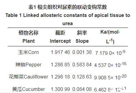 由上述方程分別計(jì)算得出4種植物的根尖分生組織對尿素的聯(lián)動變構(gòu)常數(shù)Ka,如表1所示。
