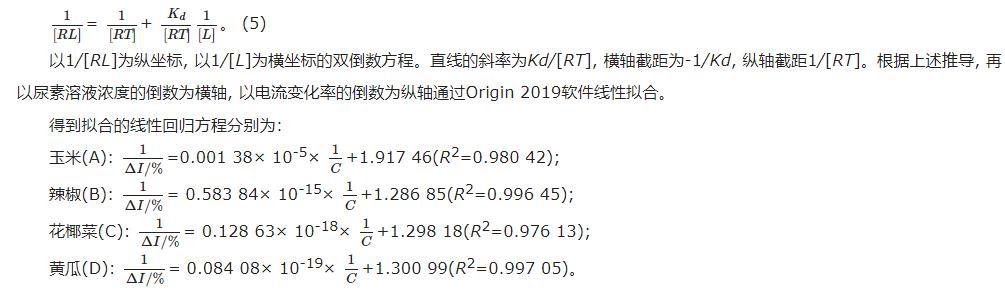 以1/[RL]為縱坐標(biāo),以1/[L]為橫坐標(biāo)的雙倒數(shù)方程。直線的斜率為Kd/[RT],橫軸截距為-1/Kd,縱軸截距1/[RT]。根據(jù)上述推導(dǎo),再以尿素溶液濃度的倒數(shù)為橫軸,以電流變化率的倒數(shù)為縱軸通過Origin 2019軟件線性擬合。